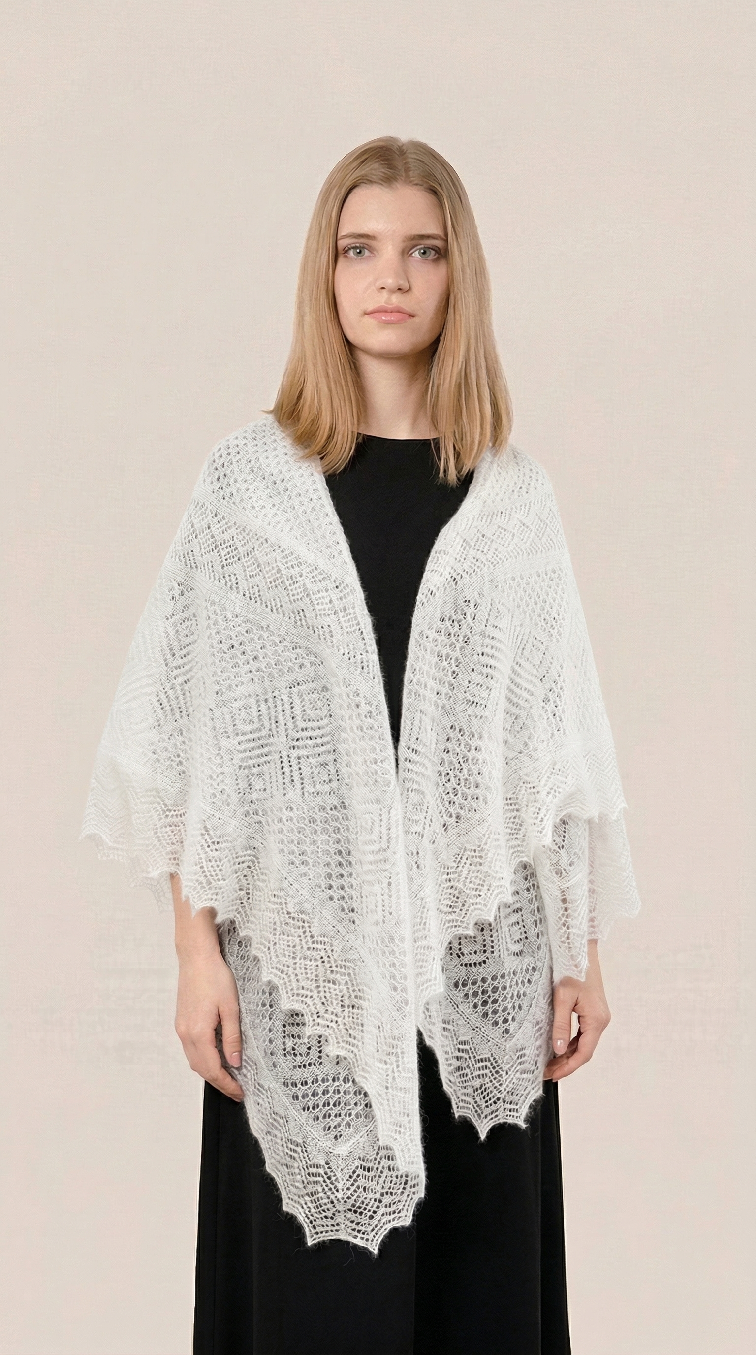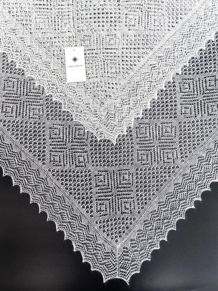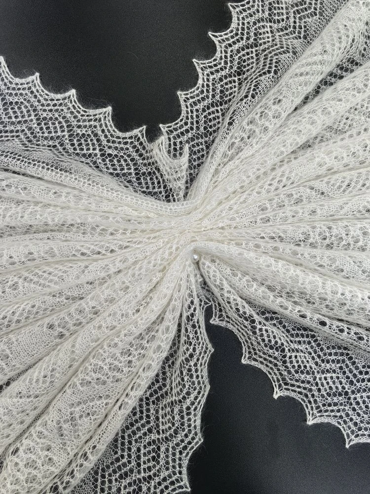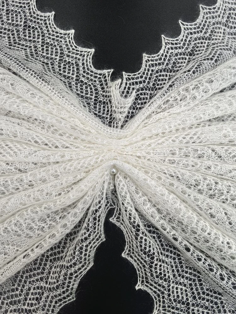 Эта элегантная ажурная паутинка обладает натуральным составом, который придает ей нежность и легкость. Благодаря наличию в составе большого процента шёлка, платок очень мягкий и струящийся, невесомый, но в то же время очень тёплый! Платок выполнен в среднем размере 140х140 см, благодаря чему красиво лежит на плечах, ниспадая нежными складками и придавая образу особую стать и грациозность.