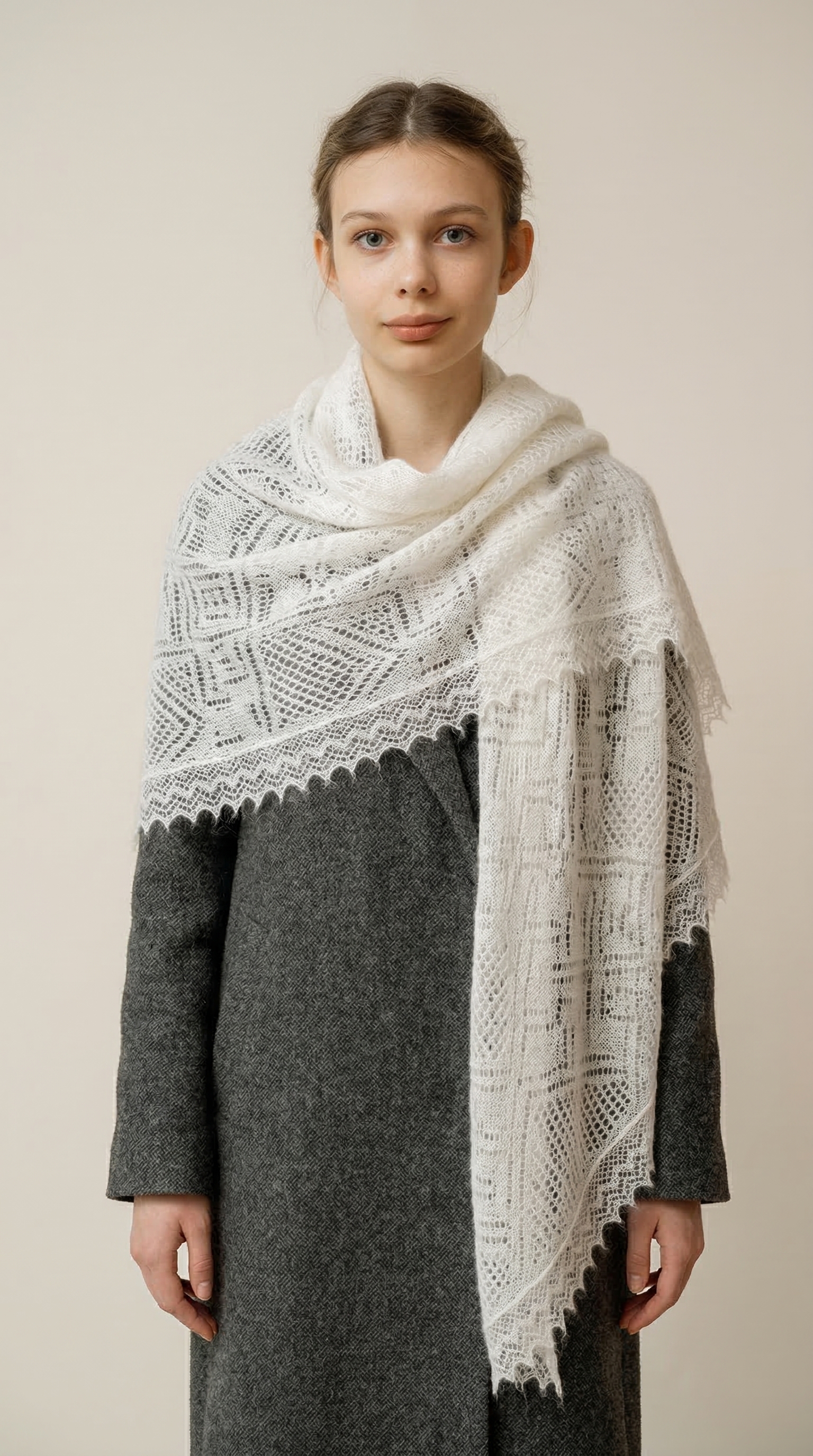 Сложить в несколько раз и использовать в качестве платка или шарфа. Этот вариант поможет привлечь внимание к лицу. Шаль, повязанную таким способом, надевают на свитера и кардиганы или под пальто, шубу и пуховик.